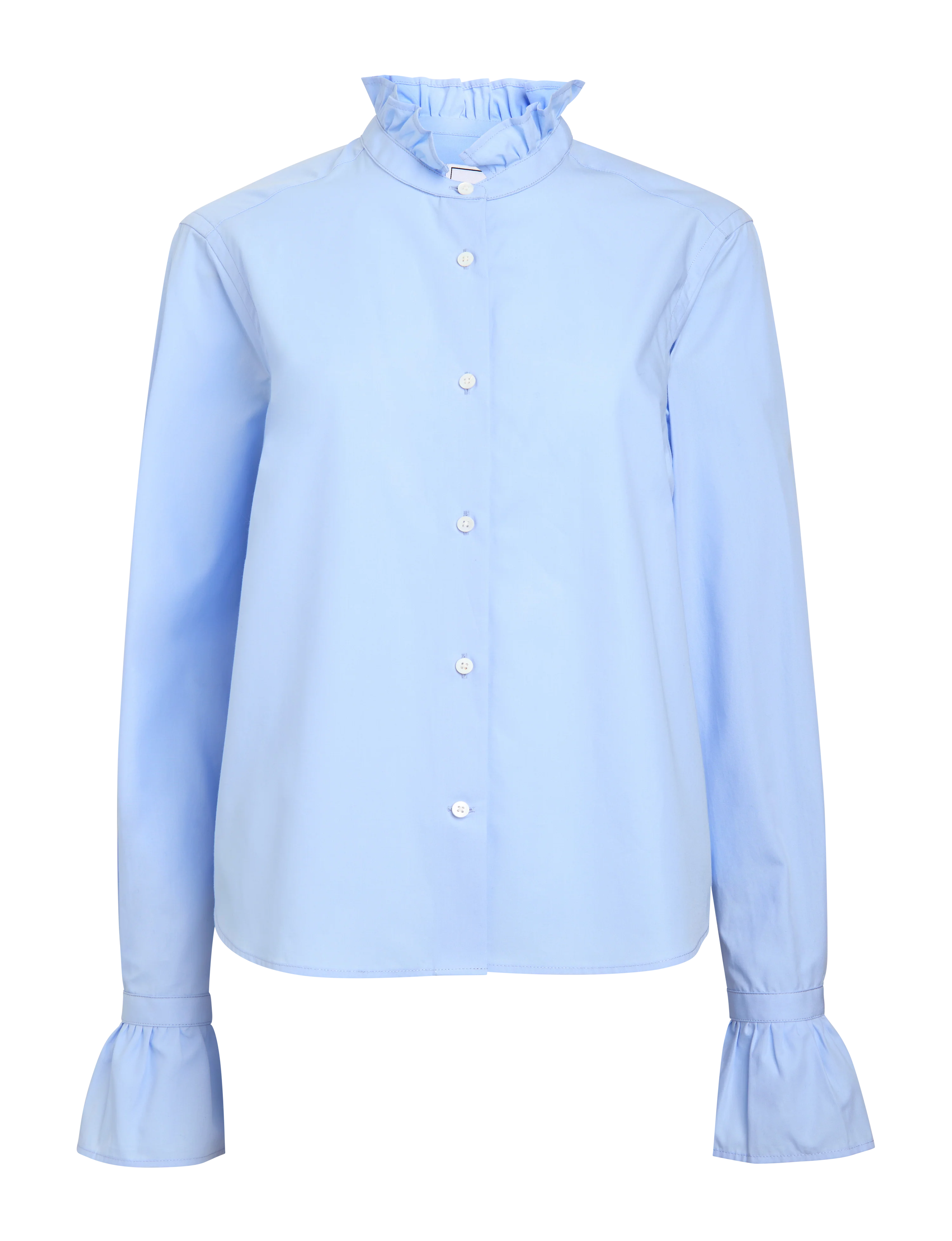 Kew Blouse: Fine Poplin, Sky Blue. Lending a light romantic note to everyday dressing, the Kew is built from a traditionally tailored shape and finished with playful frilled edges at the collar and cuffs. Wear it half-buttoned over light chinos in warmer months. When the bad weather hits, just show off the frills under roundneck knits. Designed in London, made in Portugal.