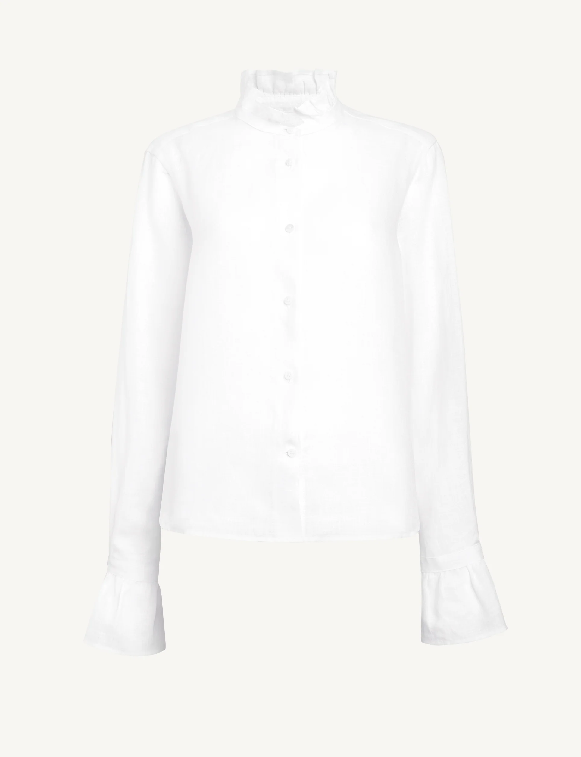 Kew Blouse: Linen, White. With its subtle frills at the collar and cuffs, the Kew blouse is our most feminine shirt. The 100% linen provides a soft layer next to the skin – allow the collar and cuffs to peek out from your knit for a thoughtful styling detail, or just add jeans in warmer weather. Designed in London, made in Portugal.