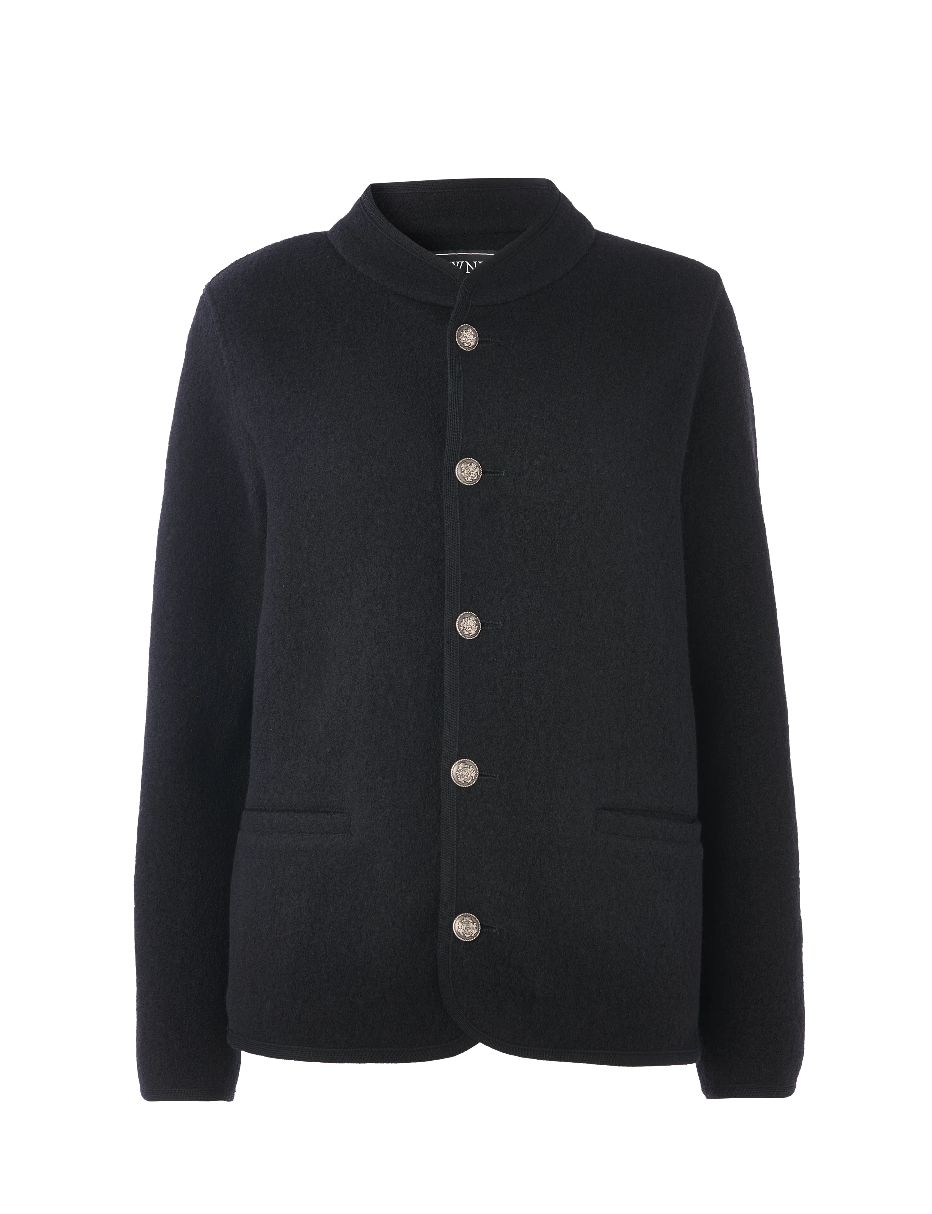 St James Jacket: Boiled Wool, Black. Precision-cut in a dinner jacket silhouette with a collarless neckline and tonal piping – and finished with heritage-inspired nickel crest buttons for a sense of occasion. In boiled lambswool, it’s impossibly comfortable, even when worn as part of a formal look. Pair with denim and a heeled boot. Or crank up the wool ratios by layering it over separates.