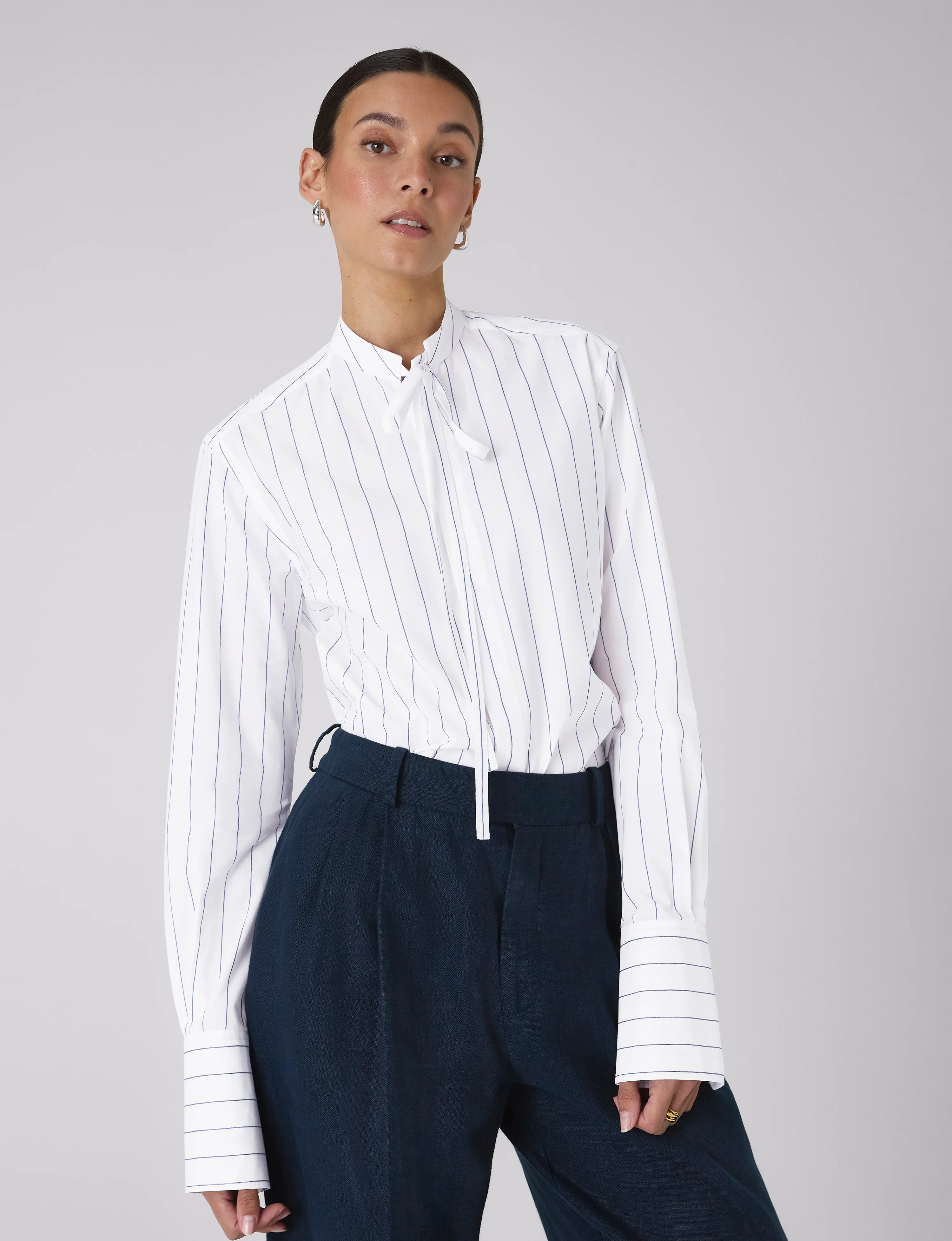 The Boyfriend Bow Tie: Fine Poplin, Blue and White Stripe. The delicate bow tie and laid-back stripes soften this structured oversized staple. Built to bring some flourish to your everyday look, it frames knitwear at the collar and cuff and makes a statement on its own.